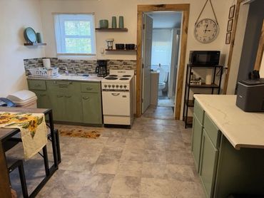 Equipped with refrigerator/freezer, microwave, toaster coffee pot, ice maker, dishes and utensils.
